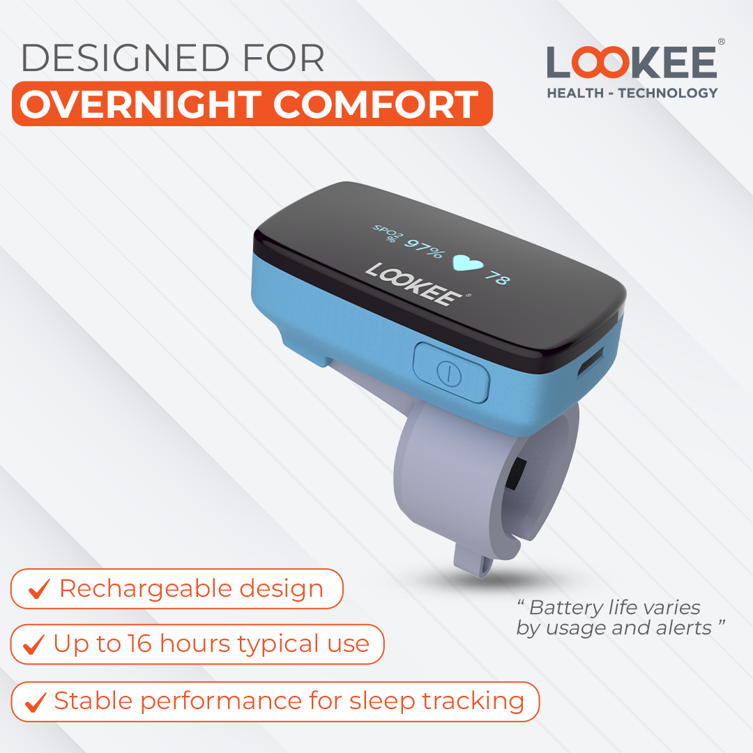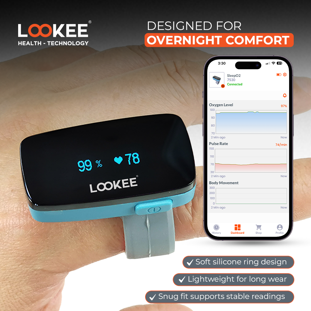 - LOOKEE® O2Ring: This monitor, designed as a comfortable ring-style wearable, monitors your oxygen saturation level, heart rate, and motion. It includes PC software and a sound alarm on the Cell phone App. Notably, this is the only LOOKEE® Sleep Oxygen Monitor featuring a vibrating alarm for heart rate fluctuations as well. Learn more here: LOOKEE® O2Ring